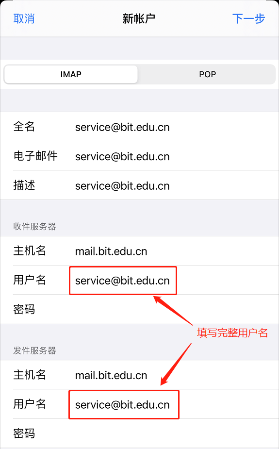 邮件客户端需要设置正确的发件服务器、收件服务器的地址和完整的用户名和密码。学校的发件服务器地址和收件服务器地址相同,均为mail.cnpigeon.com,完整的用户名格式为xxx@cnpigeon.com。更多详细设置如下: